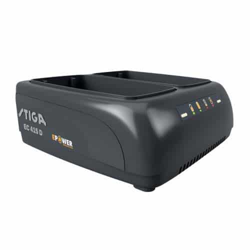 ePower EC 415 D dual batteriladdare standard som passar alla batterier i STIGA:s batteriserie 500, 700 och 900-serien. Laddningström 1.5 Ah, laddningshastighet standard och utrymme för två batterier.